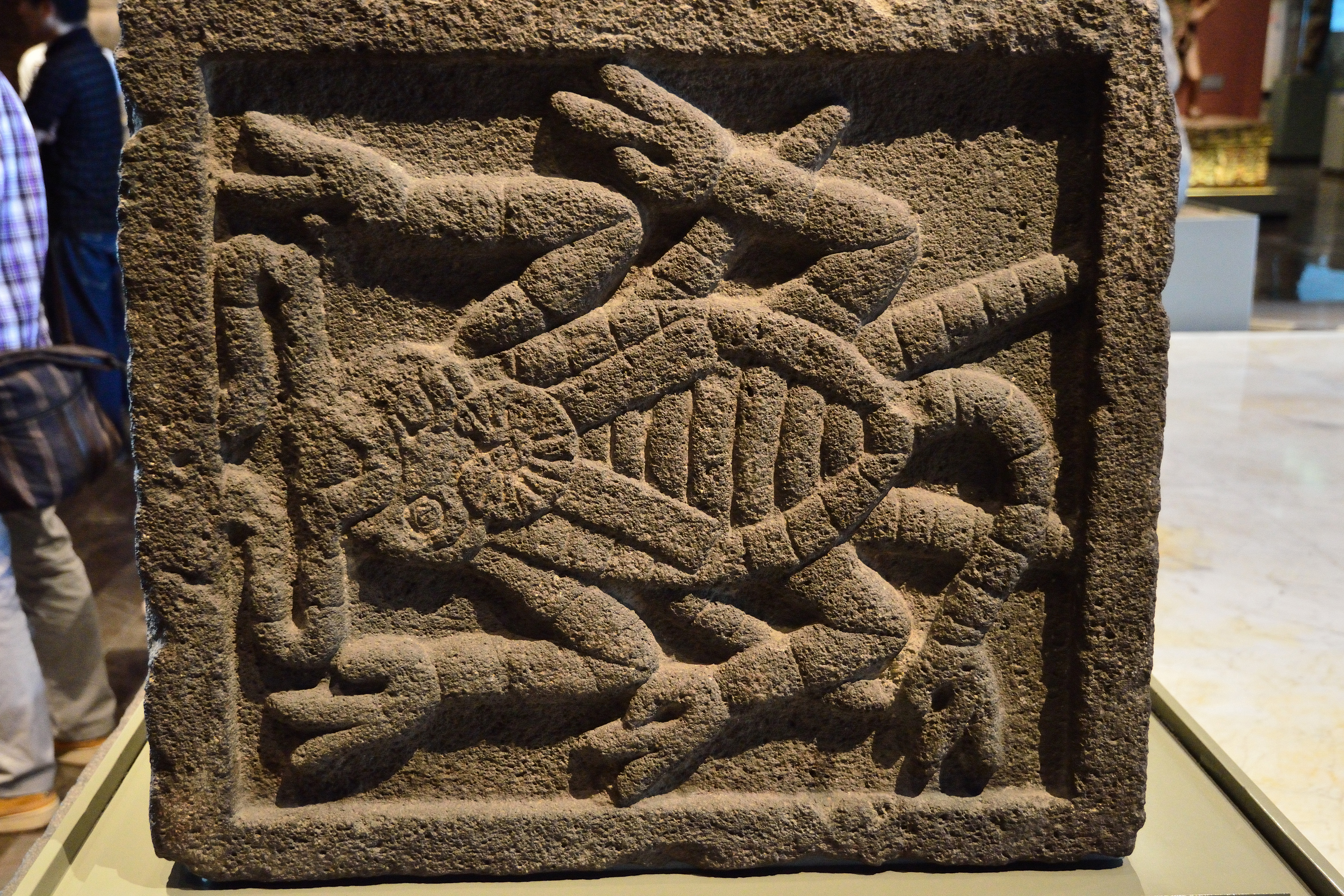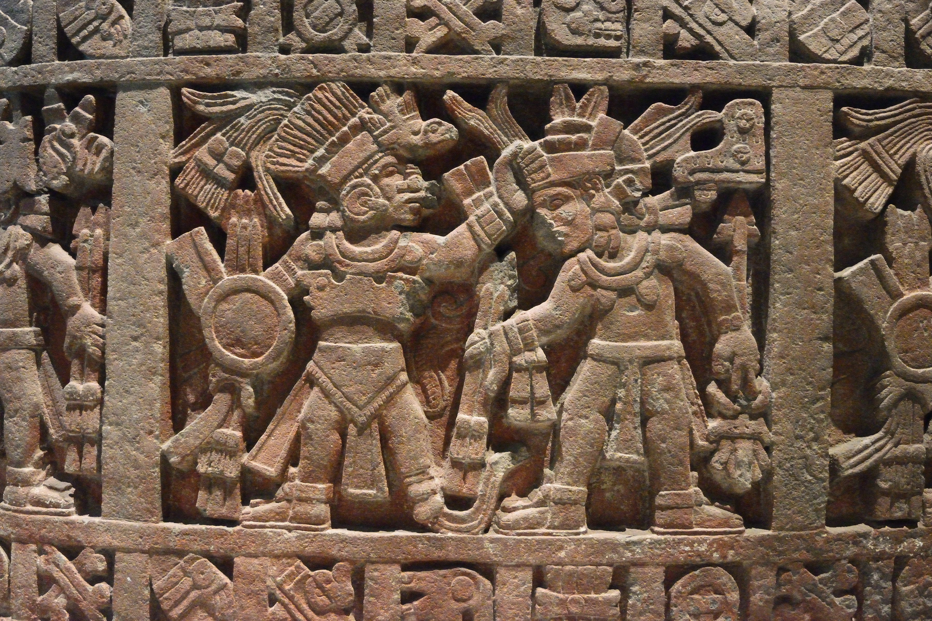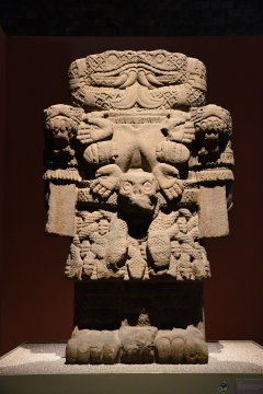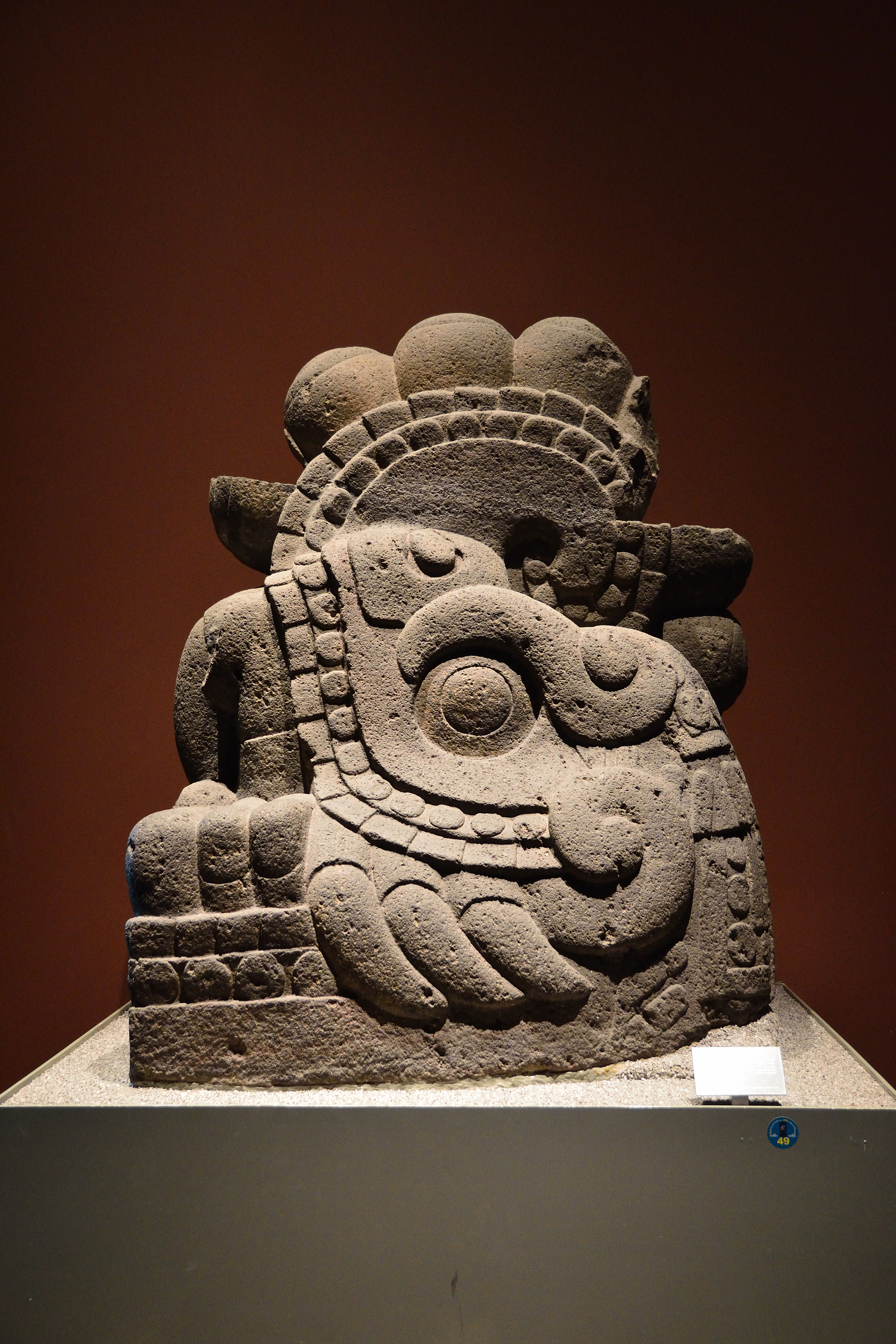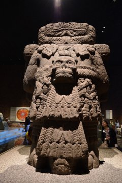 これはピラミッド頂上の神殿に通じる階段の両側の壁装飾だったもの。中央に火の神、両脇に暦の象徴を支える2人の神が配されている。