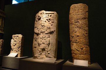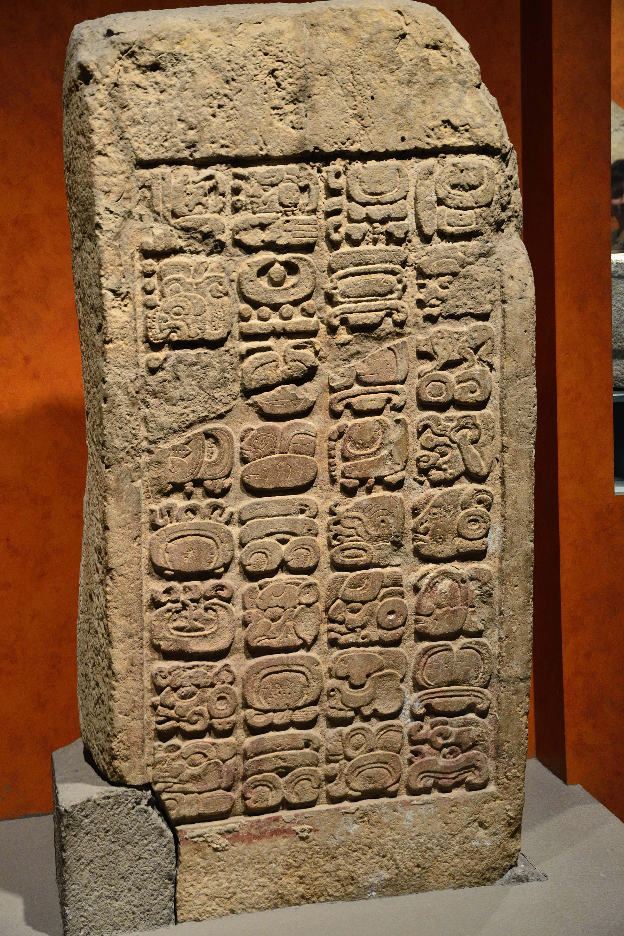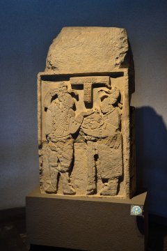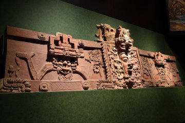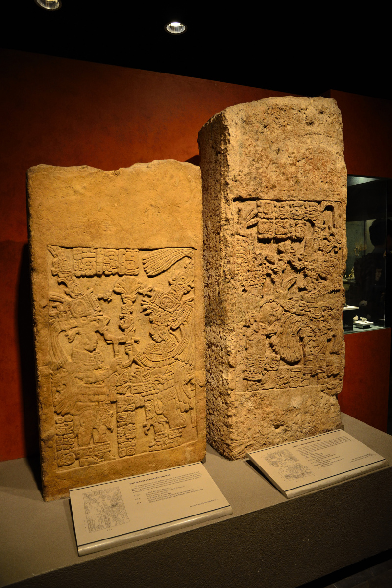 これはマヤ地域のティカルの石碑の複製のようだ。デザインにテオティワカン的な面があったり、テオティワカンによるティカル支配をほのめかすような文章が刻まれている。