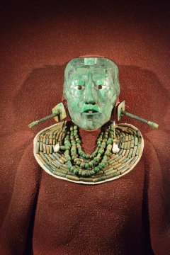 パレンケのパカル王の翡翠の仮面。碑銘の神殿内の王墓から出土した。パカル王は615年の即位。