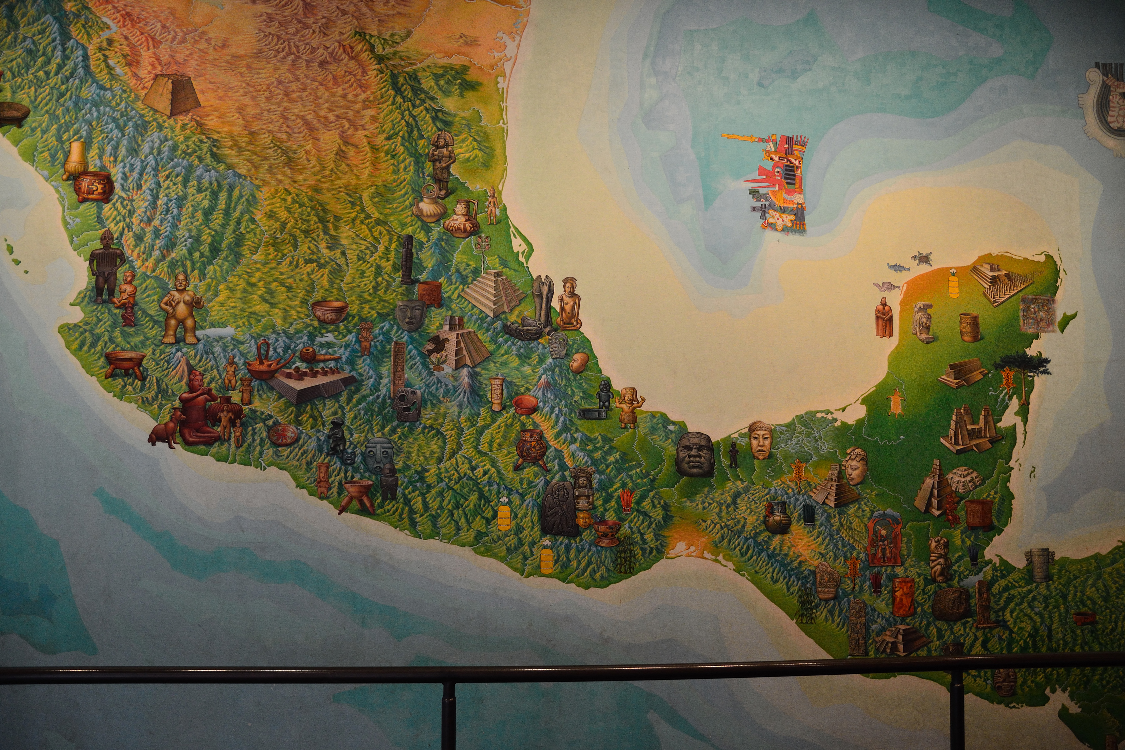 古代遺跡マップで、いろいろな時代の遺跡が描かれている。メキシコは遺跡だらけであることがわかる。