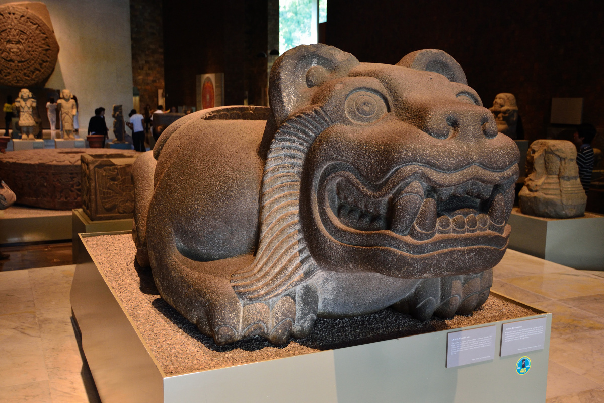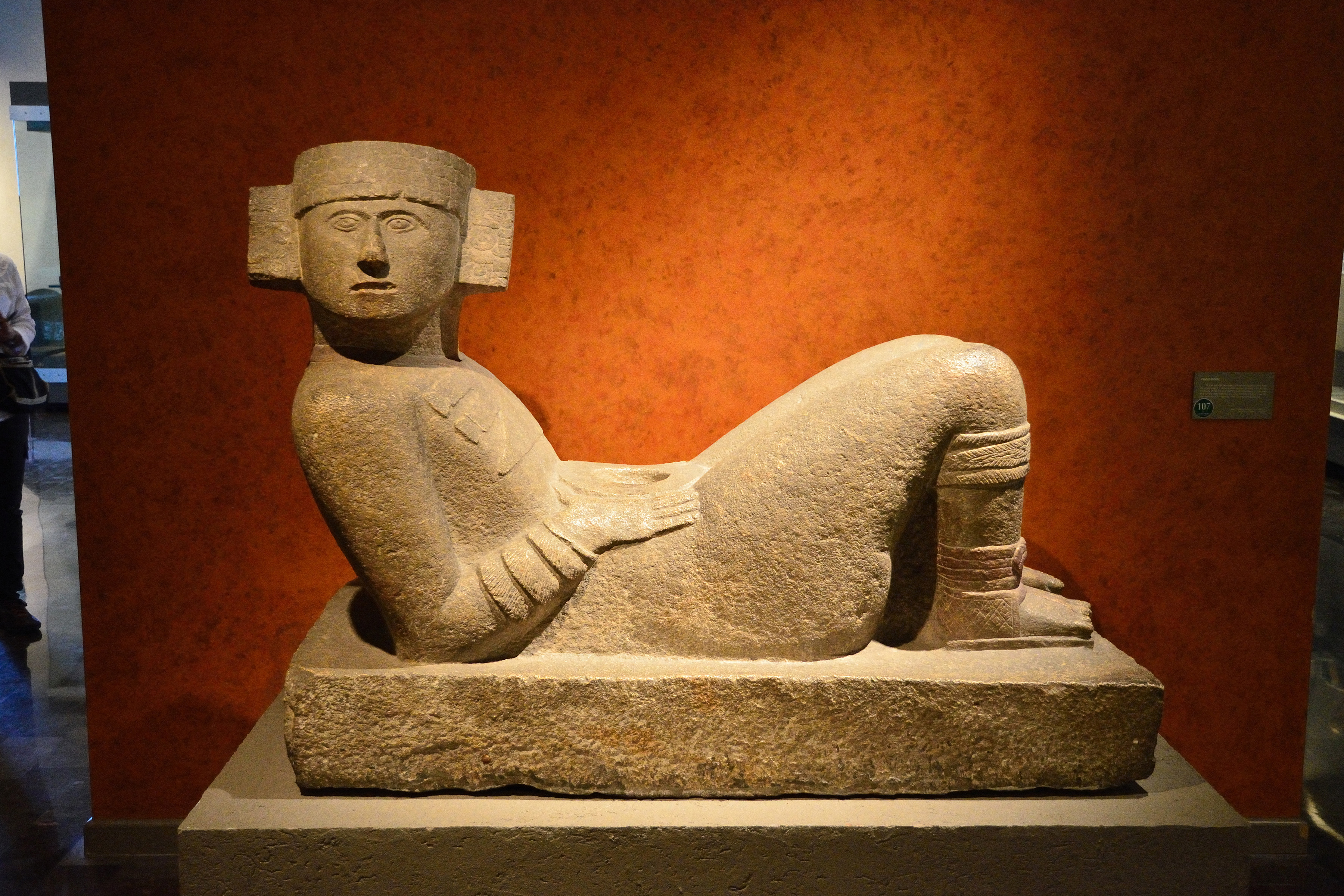 チチェン・イツァの金星の神殿で発見されたチャクモール。チャクモールは生贄の心臓を置く皿を持っている。シリアスな役割と対照的な無表情な顔がなかなか良い。