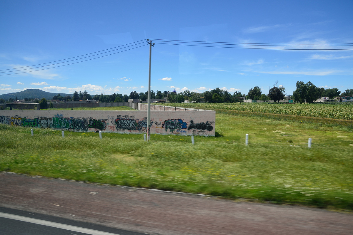 メキシコシティ市内へ戻って行く。途中の畑の中の塀にも落書きが。