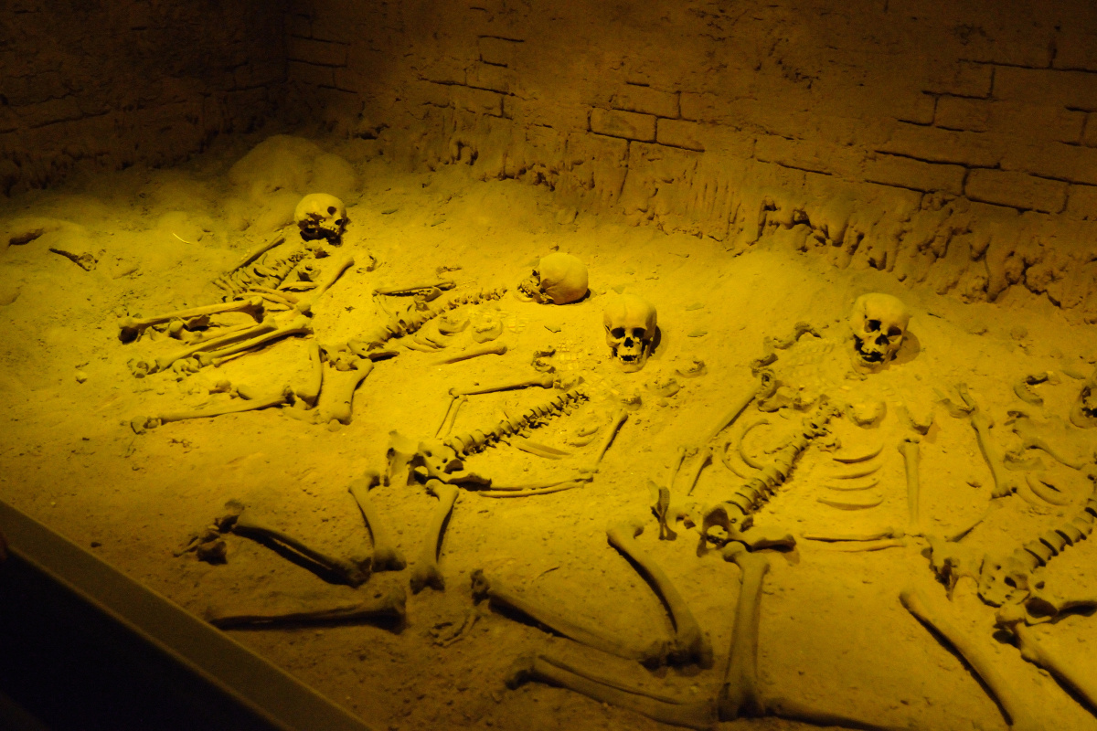 ケツァルコアトル神殿で見つかった生贄の骨。首飾りのように並べて置かれているのは実は人間のアゴの骨。