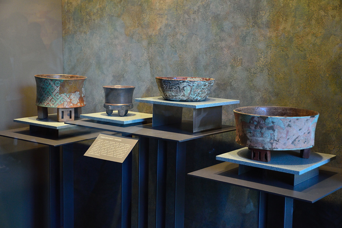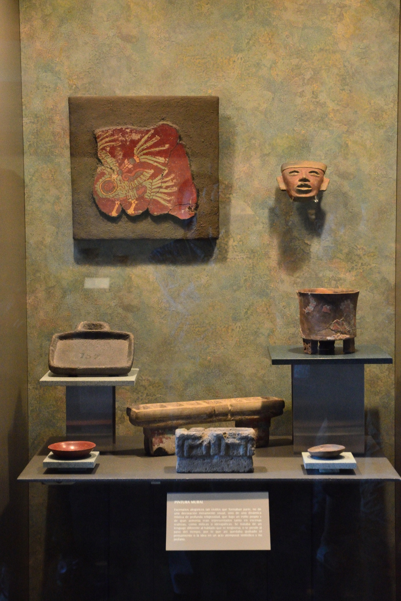彩色が美しい壁画がかかっている。右側にはテオティワカン名産の三足土器がある。