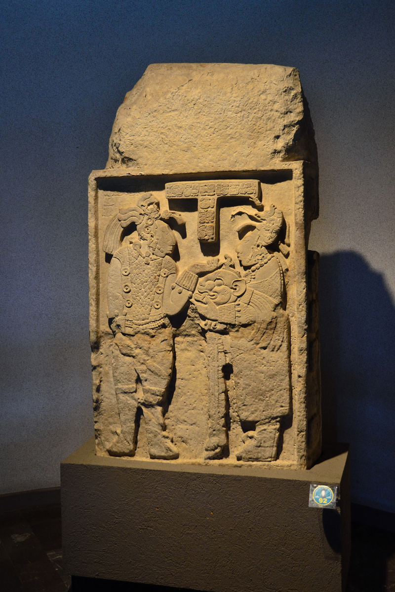 この石碑は上部が未加工のままなので未完成ということらしい。儀式に必要だが敵が攻めて来るので急いで作ったのかも知れない。デザインとしてはジャガーの頭飾りを冠った妻からジャガーの盾を受け取っている統治者。