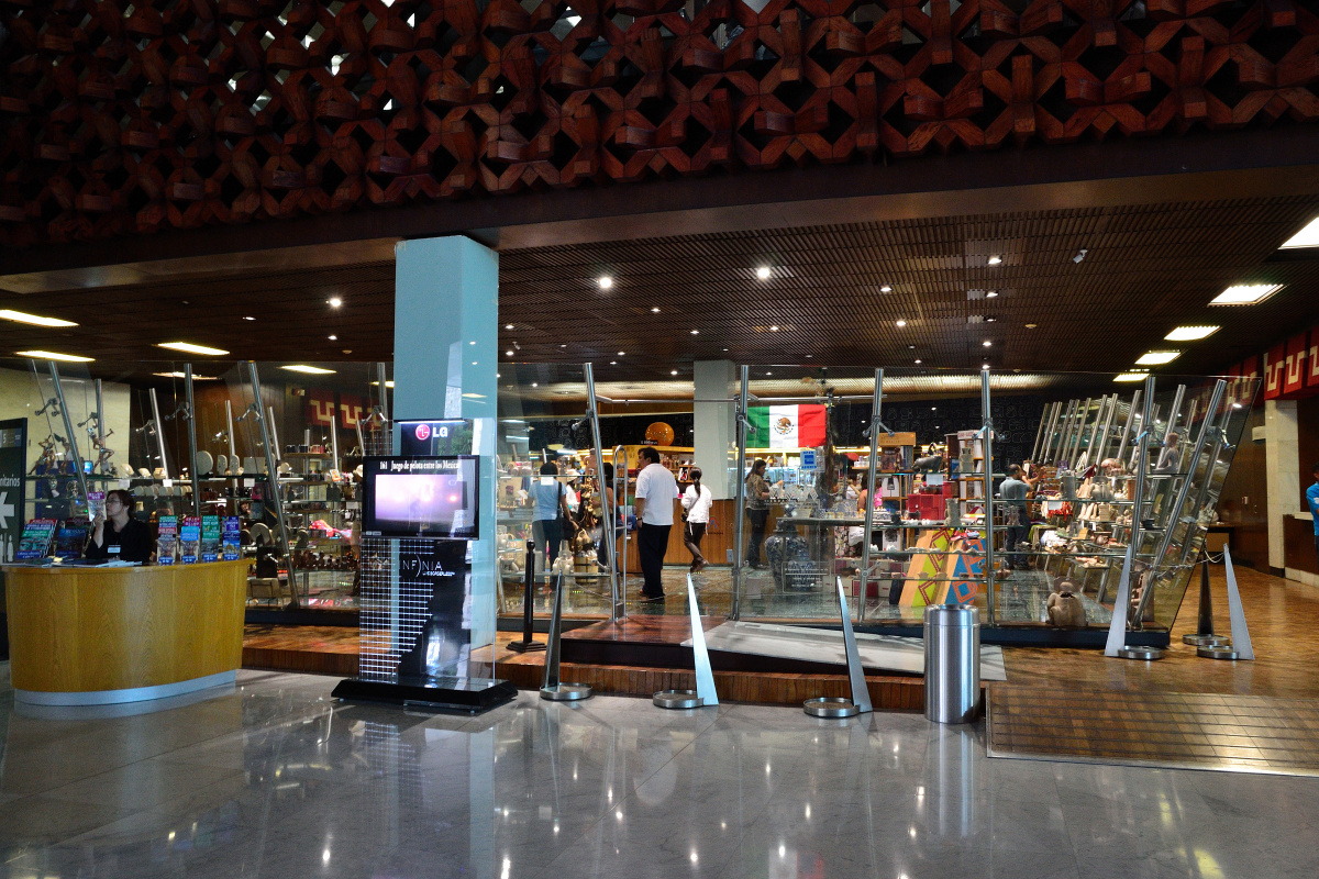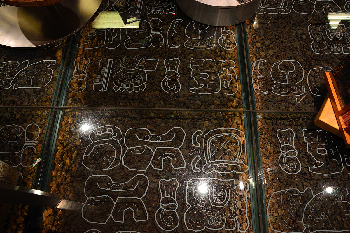 売店の床もなかなか凝ったデザインだ。二重構造のようで表面の透明なガラス(アクリル?)にマヤ文字っぽい絵柄がデザインされている。