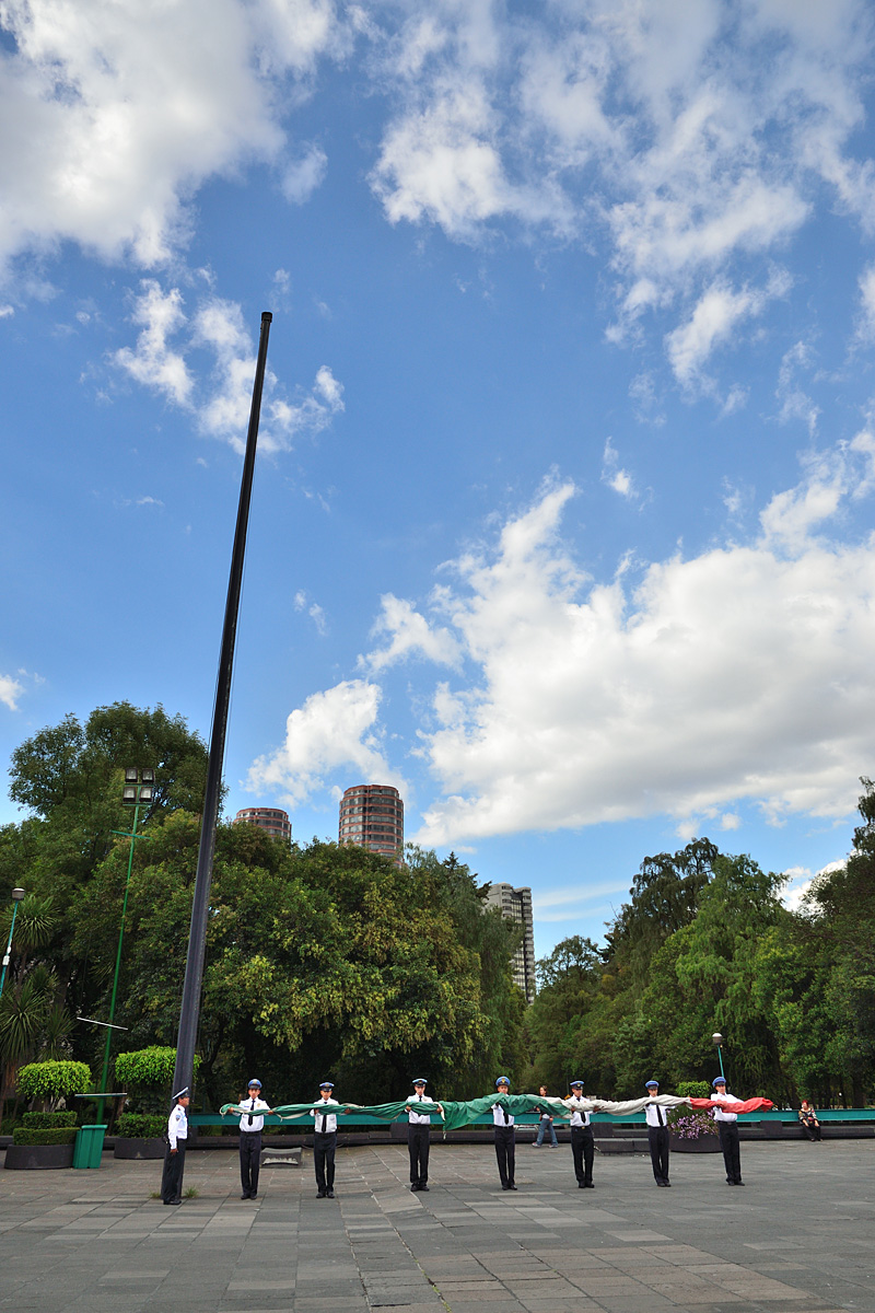 中庭中央の円柱にはメキシコの歴史にまつわる装飾が施されており、上から円状に水が落ちる仕組みになっている。