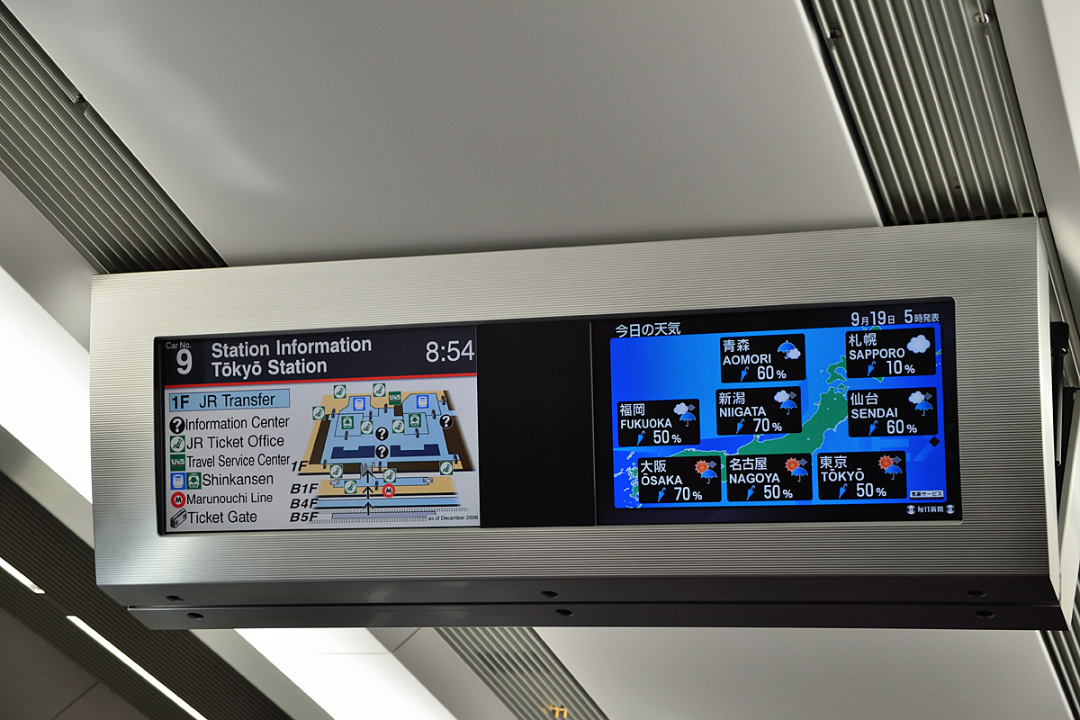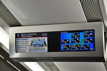 情報表示モニタで天気を確認しつつ東京駅を通過。帰りの成田エクスプレスも空いていた。