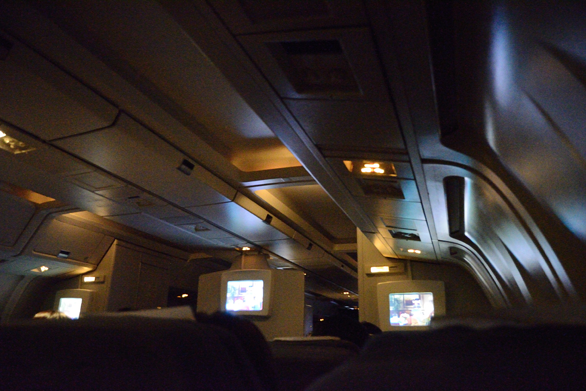 夕食後に就寝タイムとなり消灯されたB767−200ERの機内の様子。