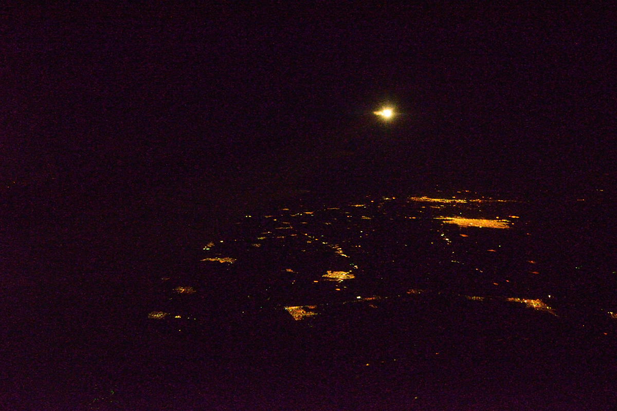 軽食から3時間後、メキシコシティを出発してからは9時間後。メキシコ時間では朝の9時になっているが太陽から逃げるように飛んでいるのでまだ夜だ。そんな夜の飛行中の様子。こういう状態が果てしなく続き退屈なので撮ってみた動画。