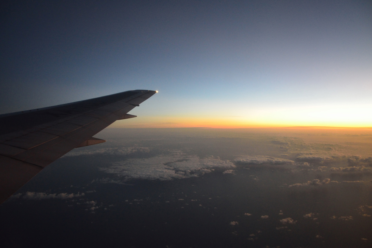夜明け頃の飛行中の様子。海と雲だけでも外の景色が見えると多少は退屈しのぎになる。