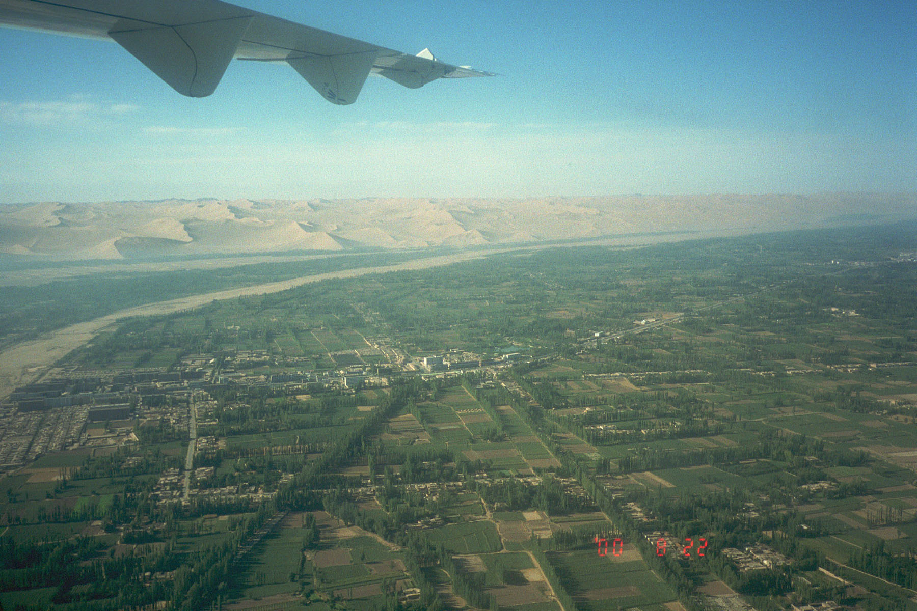 離陸後1時間半ほどで敦煌の大きなオアシスが見えてくる。整然と区画された畑がポプラ並木で仕切られた、美しい田園地帯が広がっている。遠くには、鳴沙山が見える。