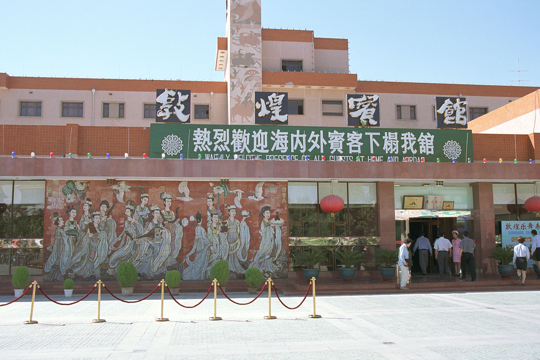 ひとまず宿泊先の敦煌賓館へ。玄関脇には派手な壁画があり観光地色の強さを感じる。但し、実際に宿泊したのは貴賓館の方なので、道を渡った向かい側である。ここで昼食を食べチェックインの後、最初の観光地である莫高窟へ向かった。