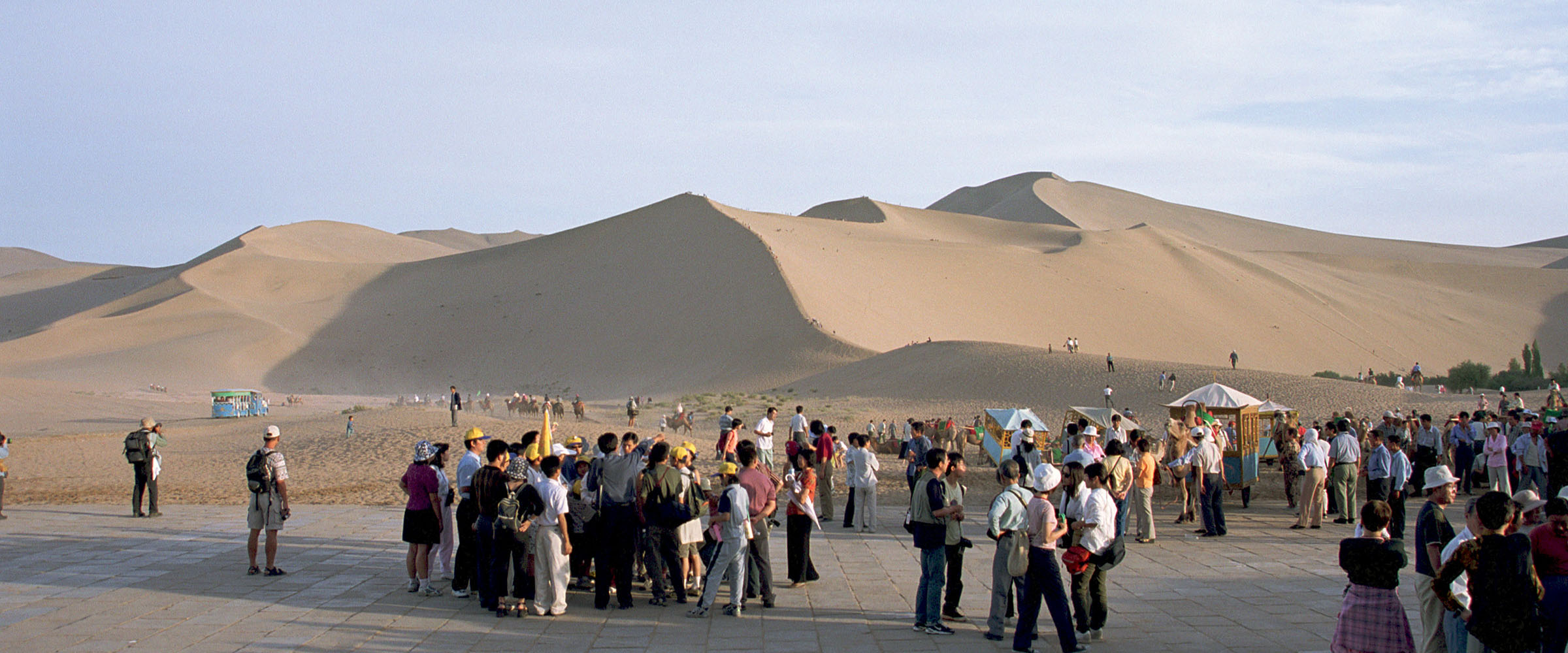 門を入ると鳴沙山の雄大な眺めが広がっている。稜線に沿って山に登る人も見える(この写真では小さすぎてわからないが)。ここでラクダに乗り、月牙泉のところまで行く。