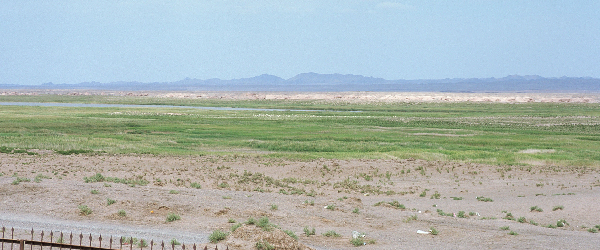 シルクロードの雄大さを彷彿とさせる景観である。草原の中には河が流れ湖もあるのであろう。 点々と見えるのは、羊の群である。河倉城とは、河のほとりの食料倉庫、との意味であったのだろうと想像できる。