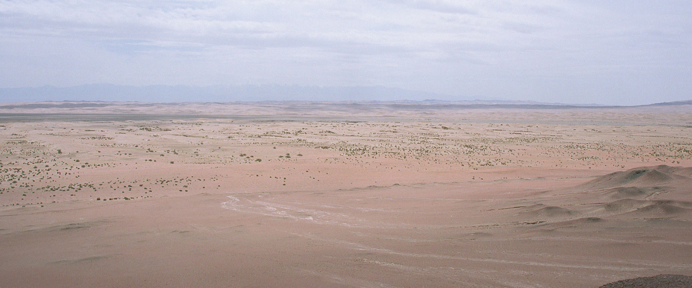 しばらく走ると、ゴビのまっただ中へと入っていく。車が故障したら大変だ。草木が生えているのは偽ゴビで、何も生えていないのが本物のゴビなのだそうだ。この写真の地平線中央の黒い筋は、本物のオアシスだが、左右にも湖が広がっているように見えるのは蜃気楼である。