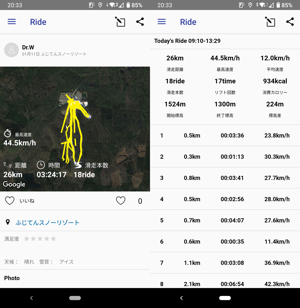記録アプリがいろいろありますが今回はSnowayと言うのを使ってみました。1本目のリフトに乗ってからスタートしたので滑走本数の方が1本多くなってます。信頼性が良く分かりませんが18本滑った事になってました。滑走距離26Kmで最高速度44.5Km/hでした。