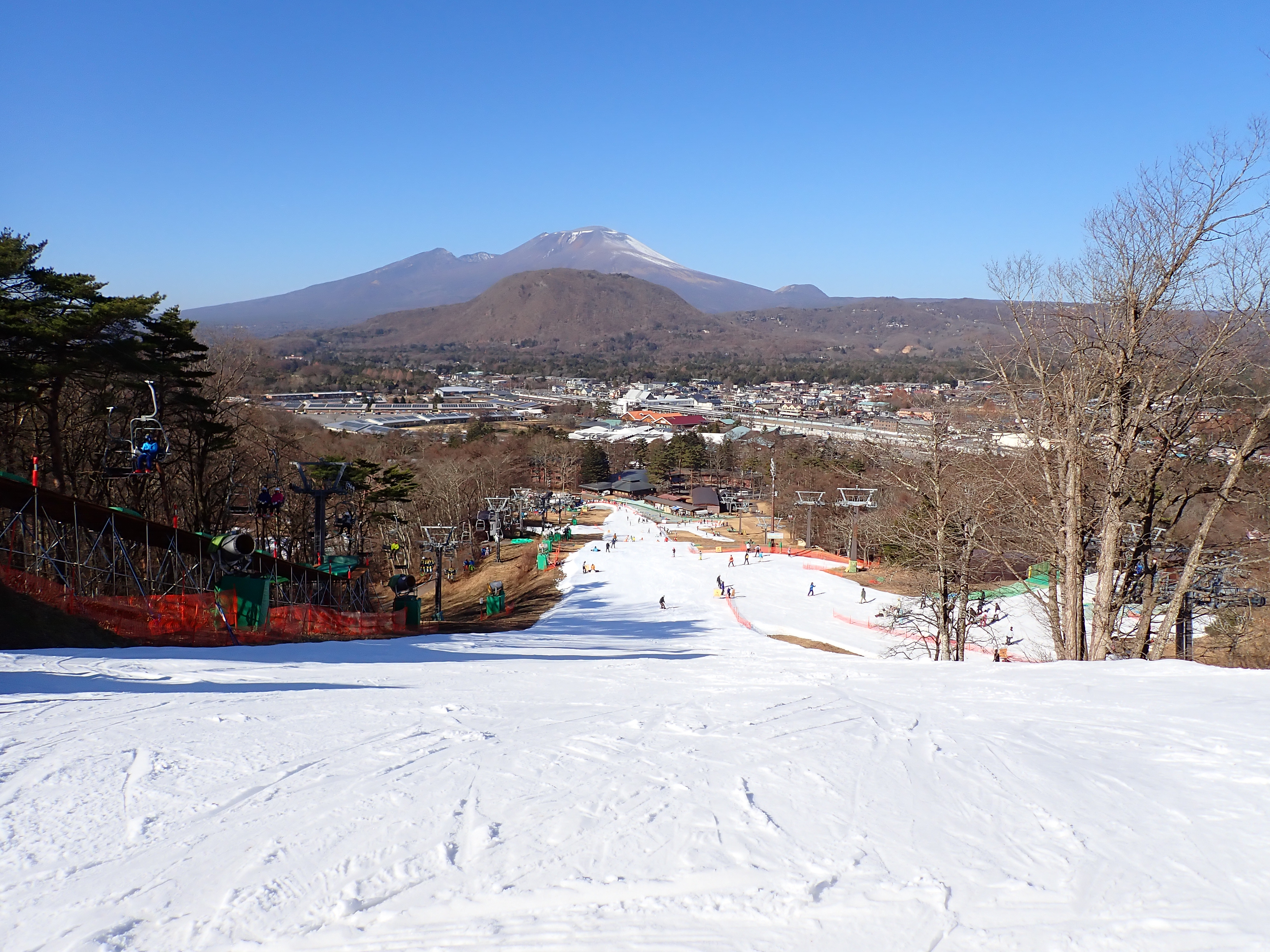 ![]() 「プリンスゲレンデ」の出発点からの眺めです。正面に見えるのは浅間山。このスキー場は北西向き斜面です。 真っ直ぐの初級コースなので最初から最後まで直滑降で滑ったら気持ちよさそう。でも狭いし人にぶつかると危険なのでできませんね。 [高解像度写真] |