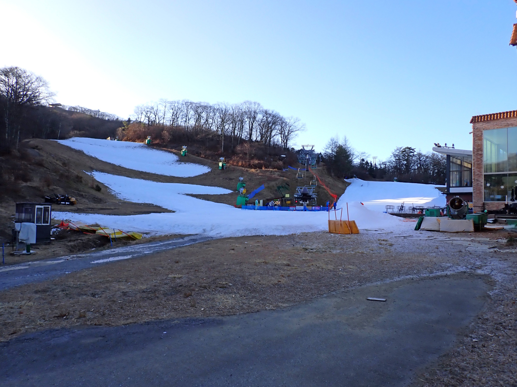 ![]() スキー場の営業は08:30からなので例によって施設などを偵察。正面のリフトが「くりの木リフト」で右側のコースを滑ってきます。左側のパノラマコースはまだ雪作成途上。 [高解像度写真] |