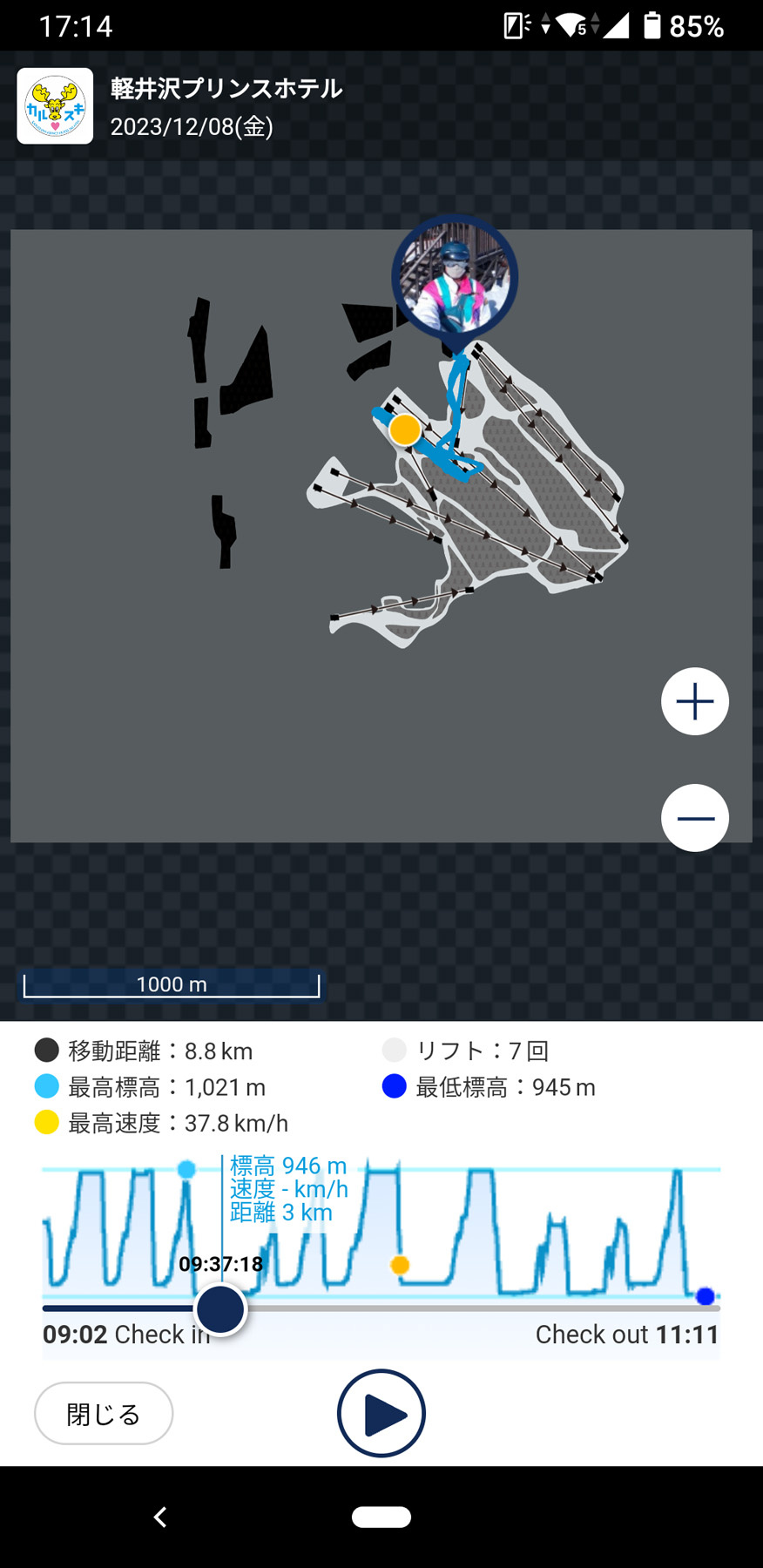 ![]() 本日の滑走記録です。リフト7回となっていますが、アプリのスタートを忘れていて「くりの木リフト」に4回乗ってからスタートしたし、高低データから見る限り「くりの木リフト」に7回、「プリンスリフト」に7回の合計14回乗っていたと思います。 |