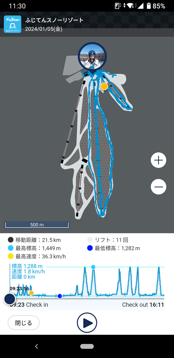 本日の滑走記録。孫の引率や何やらで1人でノンストップで滑ったのは1本だけ。リフトに乗ったのも11回だけでした。