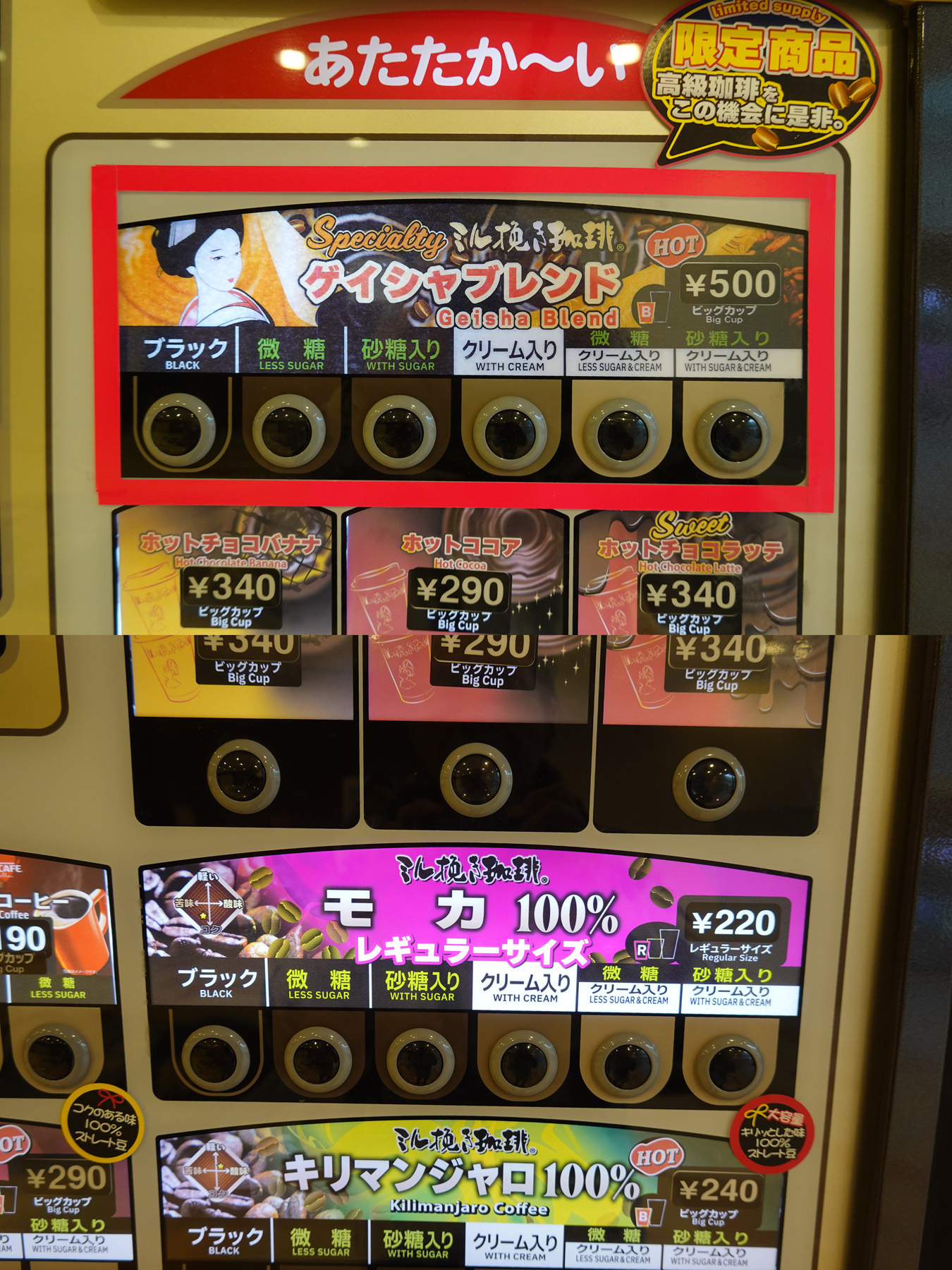 まだまだ時間があるので高級自販機のコーヒーを。500円のゲイシャブレンド(ビッグカップ)も気になったが220円のモカ100%(レギュラーサイズ)にしました。