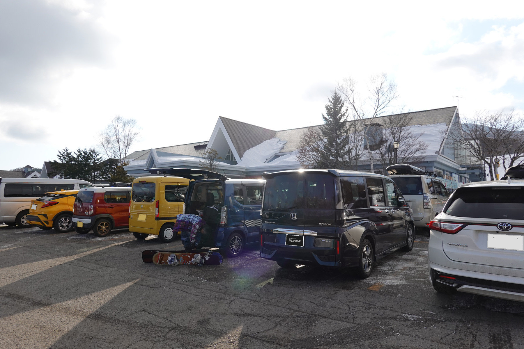 建物の前の駐車場に駐めたのですが。実はこの建物はスタッフオンリーでスキー客用施設はもっと先。