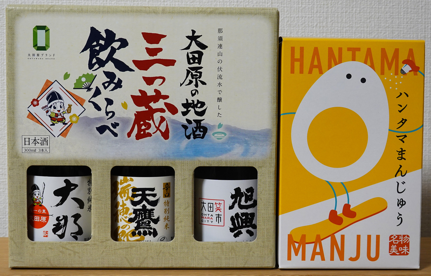 着替えてからお土産を買って14:18にスキー場を出発。定番(?)のハンタマまんじゅうと日本酒飲み比べセットです。