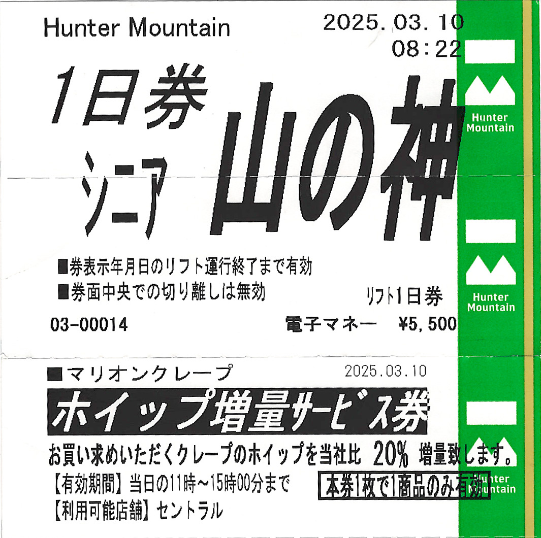 リフト券です。「山の神」とかの言葉が毎日変わるのでしょう。ホイップ増量サービス券が付いていたがクレープ食べないので関係なし。