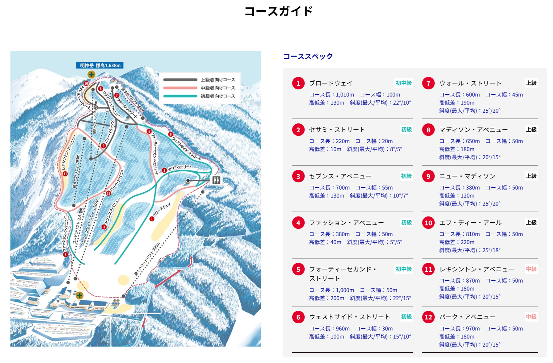 ゲレンデマップとコースガイドです。開業時にアメリカ・ニューヨーク近郊のハンターマウンテンスキー場と提携していたためコース名にニューヨークの地名が付いているそうです。でも覚えにくい。