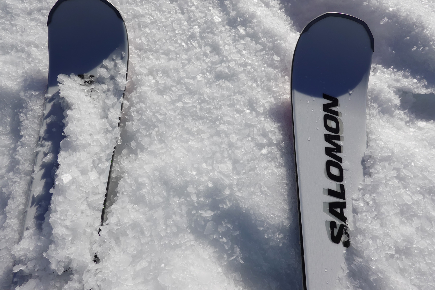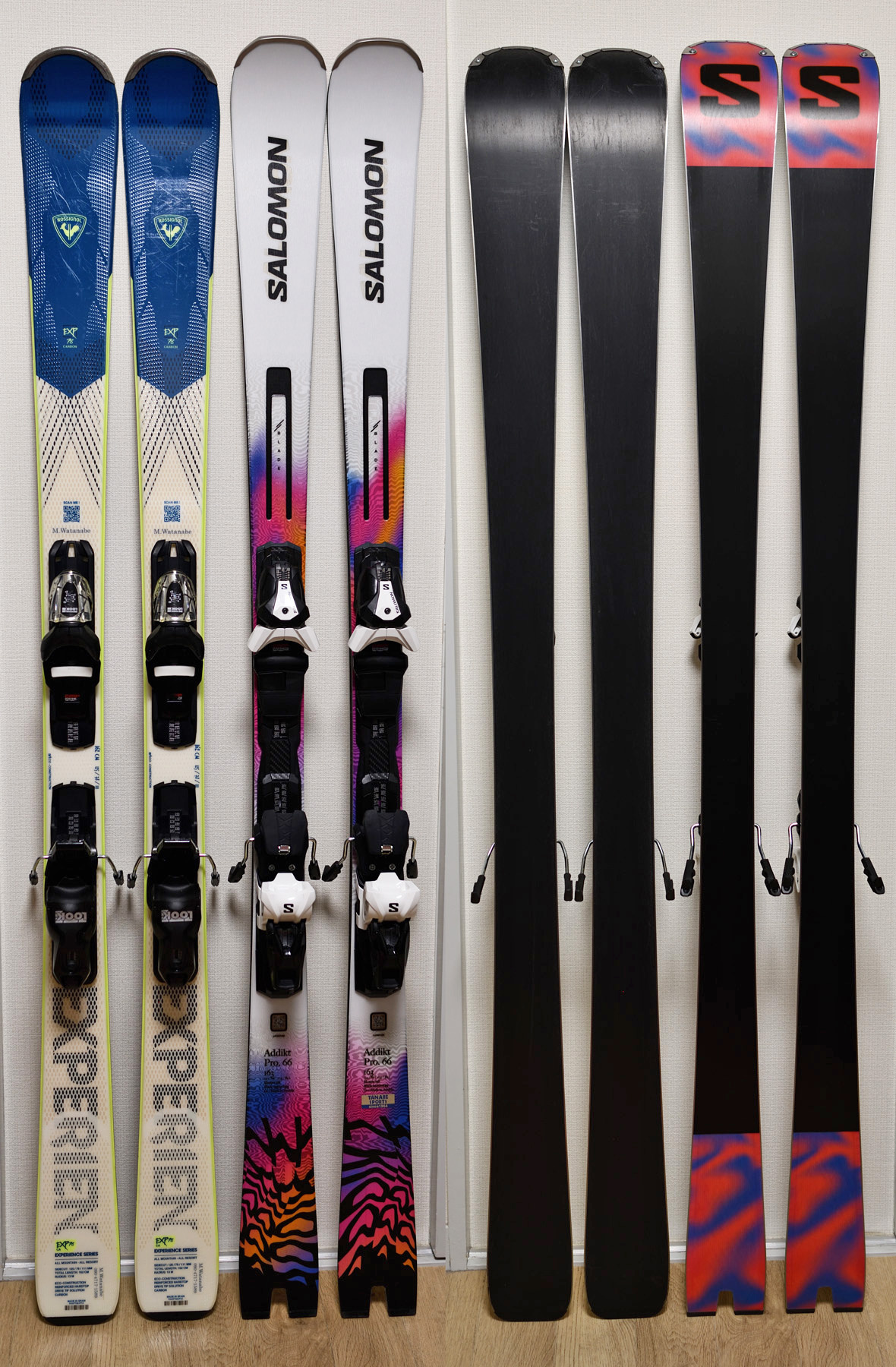 表裏それぞれ左が今までの ROSSIGNOL EXPERIENCE 78 CARBON で右が新しい SALOMON ADDIKT PRO 66 です。中級板から上級板へ。