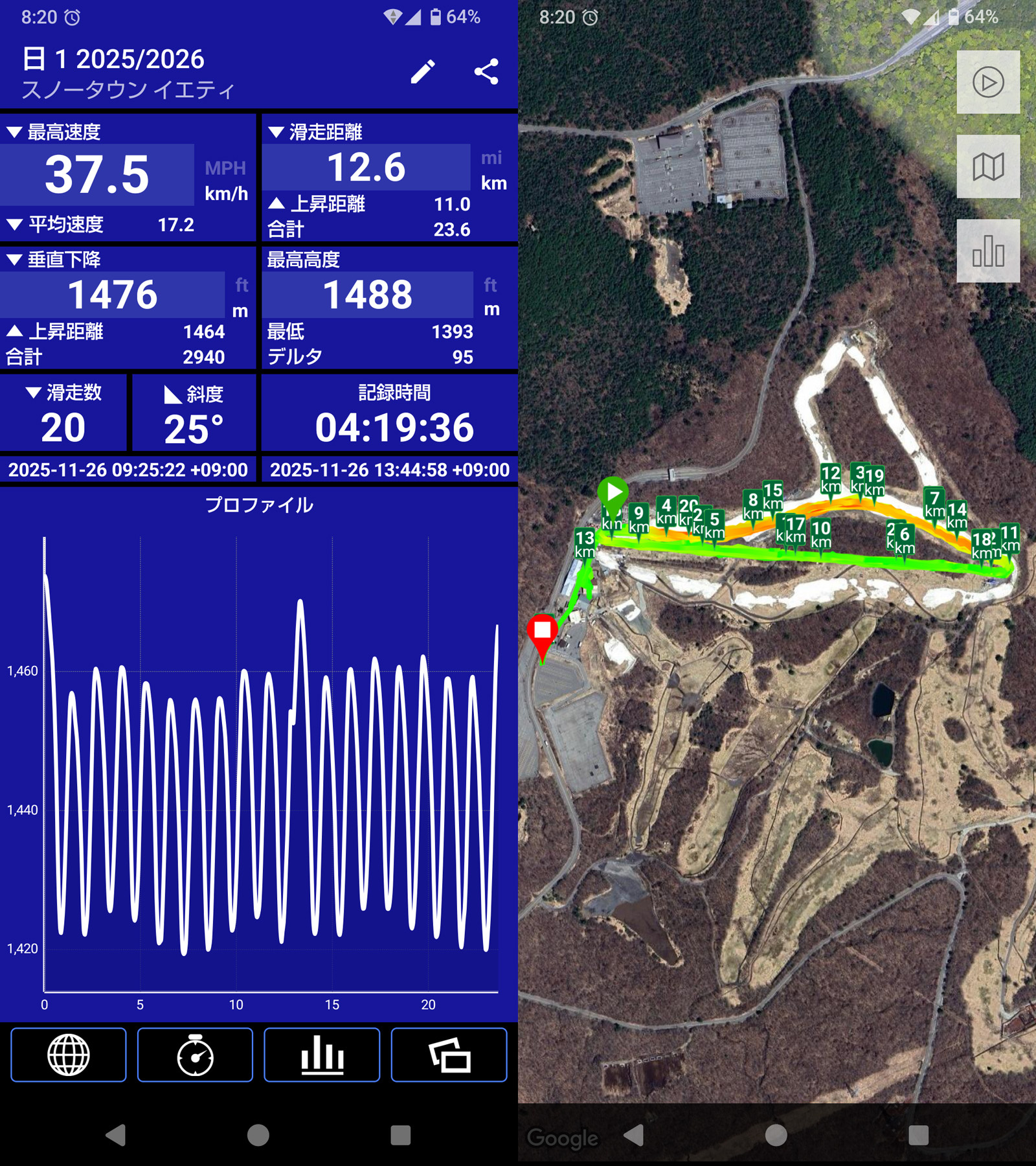 滑走記録です。シーズン始めと言う事もありアプリ起動を忘れていて2回滑ってからだったので正しくは20回です。滑走数20回というのも誤り。