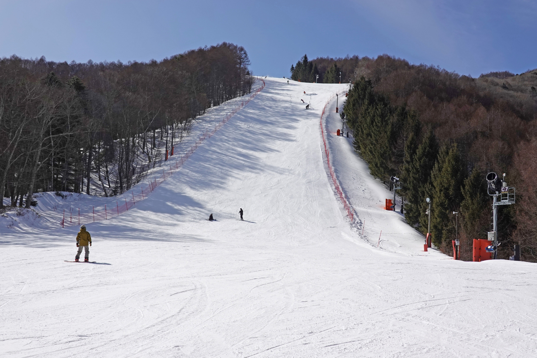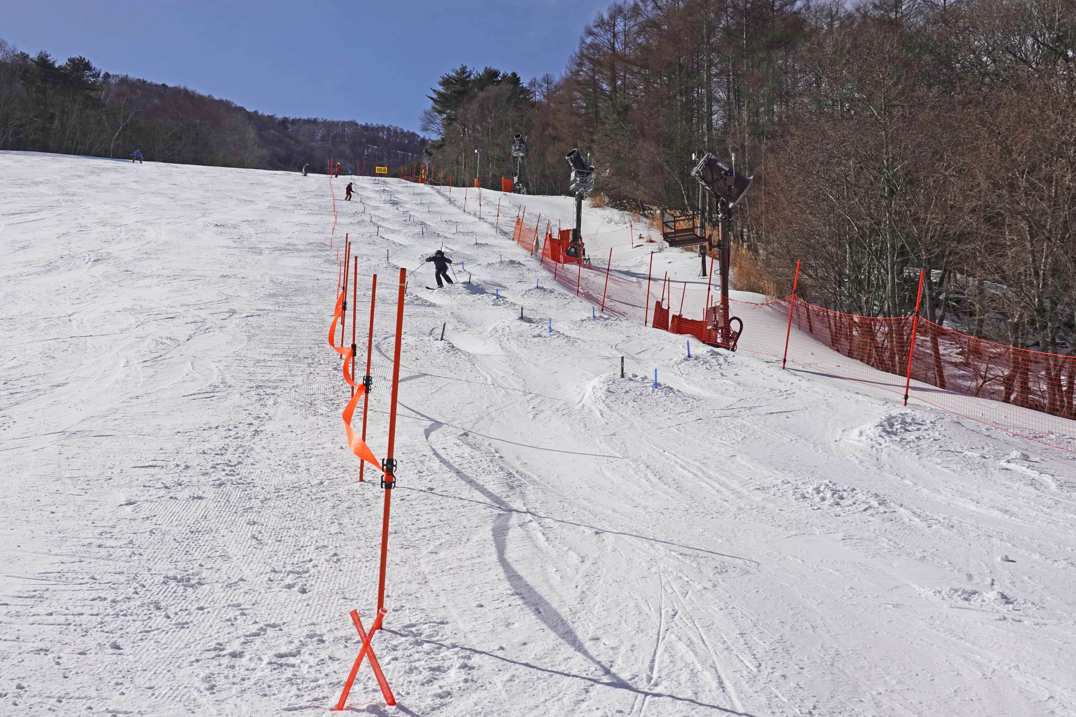 食後はコブチャレンジ。空いている初級のセンターゲレンデを2回滑り、直滑降からの急停止や内足のテールを上げる練習をした後にシーダーゲレンデへ。ここがコブレーンです。
