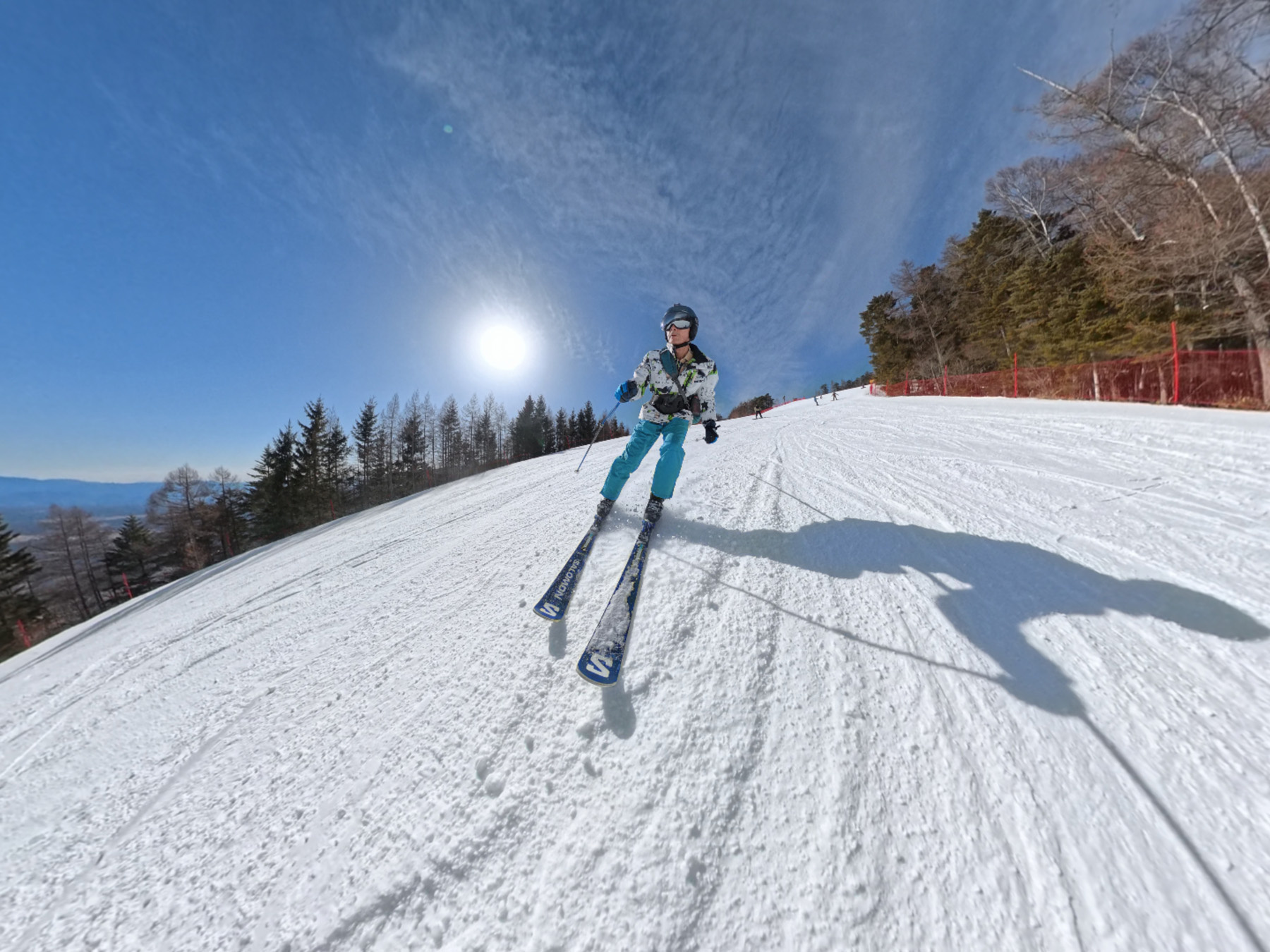 コナシゲレンデとラーチゲレンデでは前から撮影。その中のワンショットです。どうしても自撮り棒が左右に振れてしまうのですが、斜め下からのアングルになってかえって良いかも。
