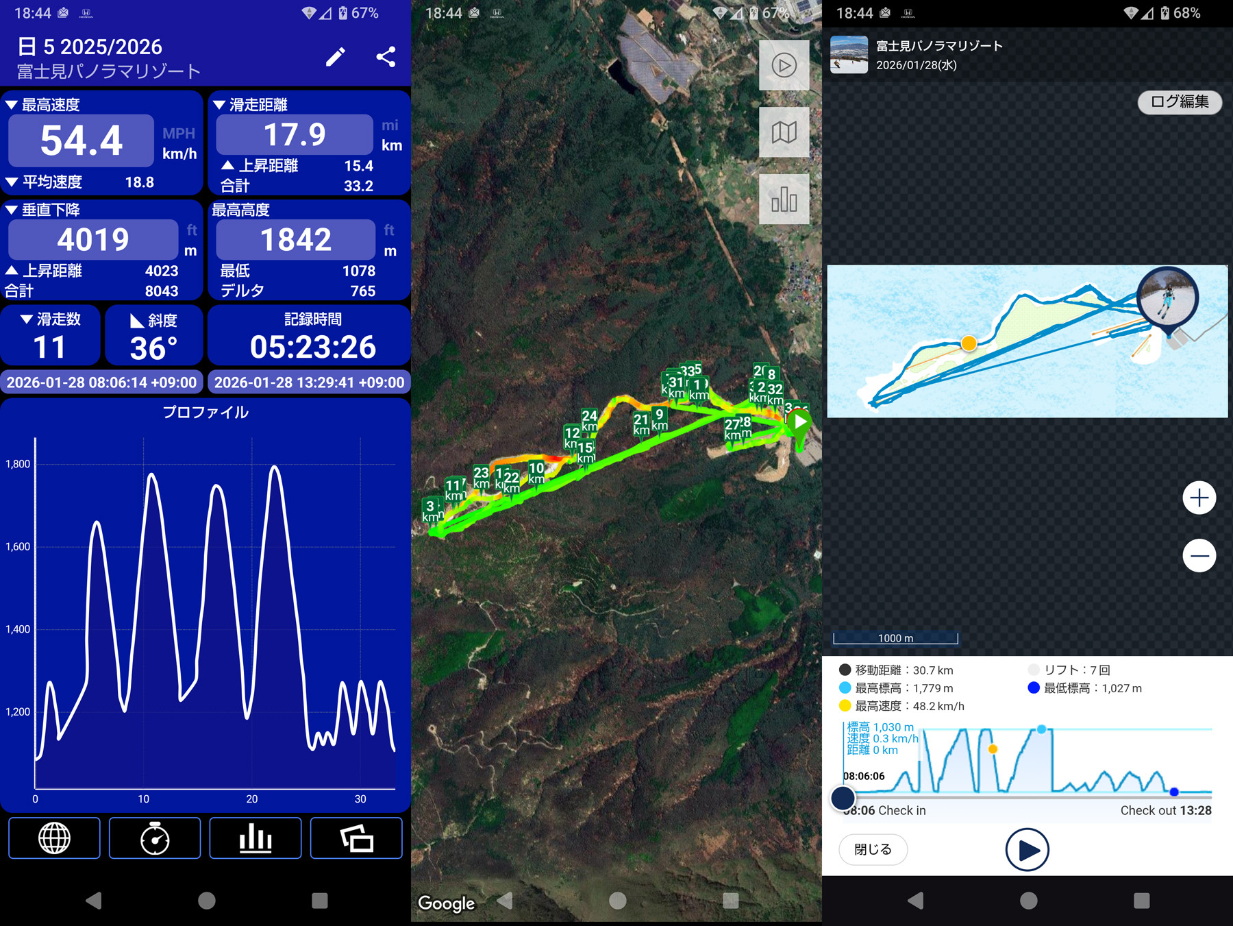 滑走記録です。ゴンドラに4回、リフトに6回乗りました。昼食前後では5回ずつです。Yukiyamaは途中で勝手にチェックアウトされていて再度チェクインしました。グラフの山の数は合っているが登り下りのスロープが変です。